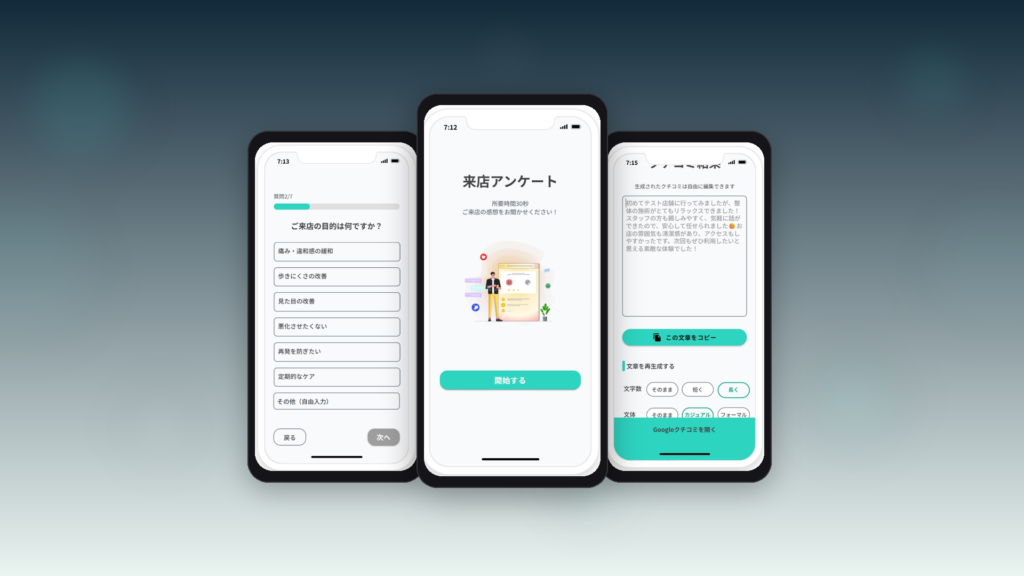 設問数を10問から7問に減らす、ボタンの配置を調整する、アニメーションを追加する。一つひとつは小さな変更ですが、現場で実際に使う人の視点に立った改善を柔軟に重ねられたことが、最終的に「今まで取れなかった口コミが取れるようになった」という成果につながっています。