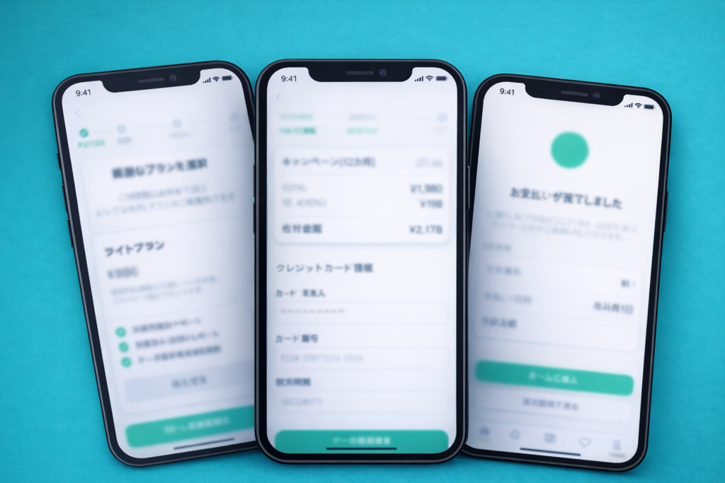 「プラン選択→支払い情報入力→確認→完了」というステップ型のUIは、各ステップで入力されたデータを保持しながら画面を遷移させる状態管理が必要です。ユーザーが「戻る」ボタンを押したとき、入力内容が消えないように設計することも重要な要件のひとつです。