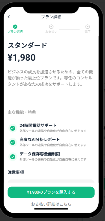 | 購入フロー | ステップUI(プラン選択→支払い→完了) |